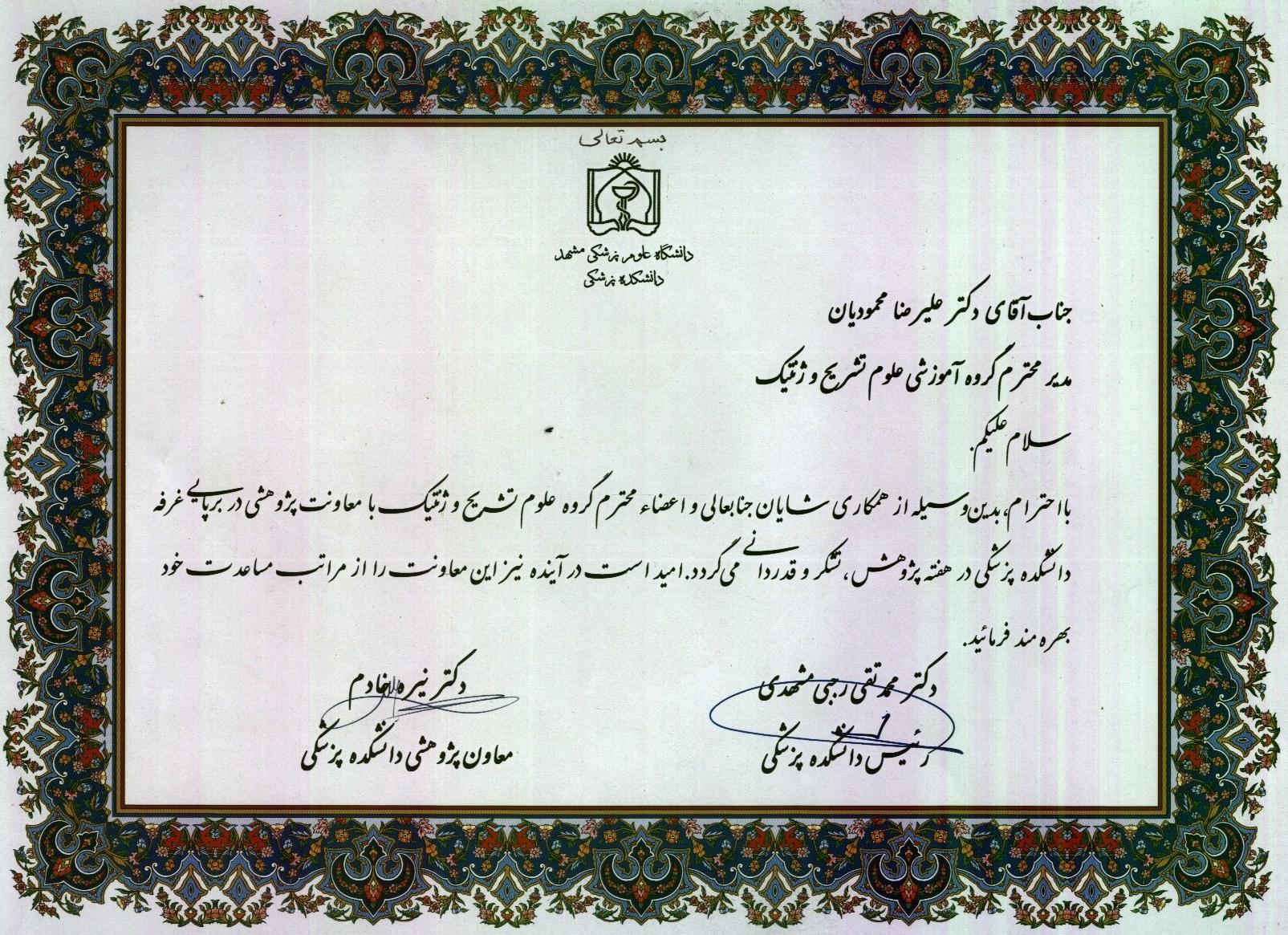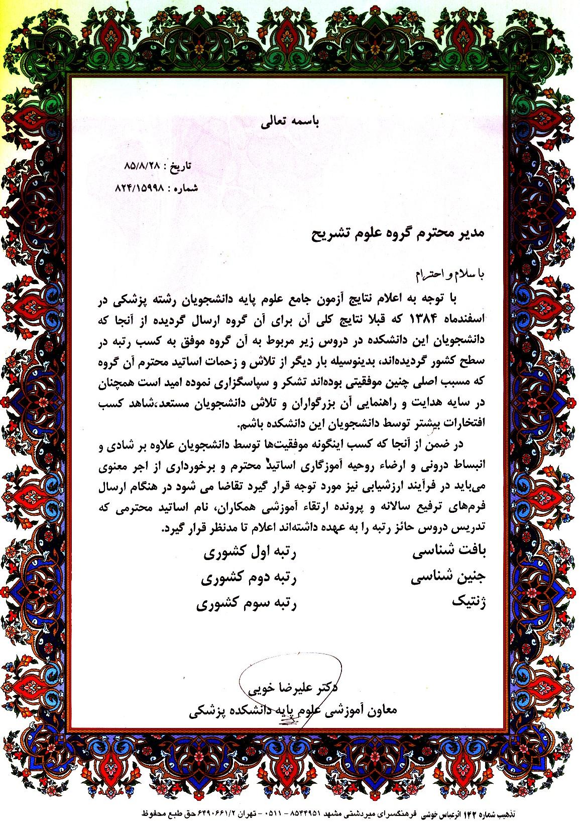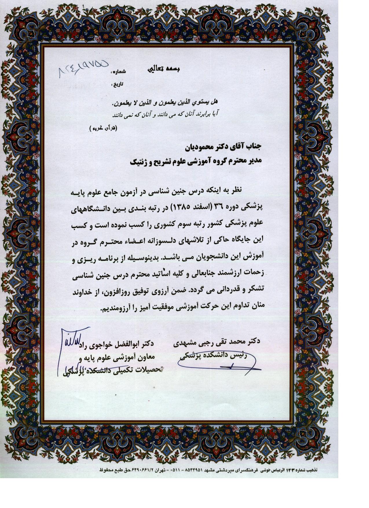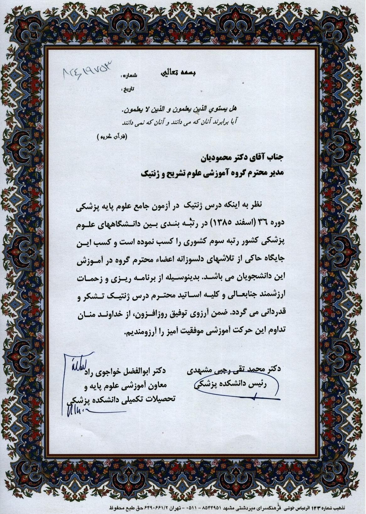 18 بهمن 1391 18 خرداد 1388 بازدید: 2920 امتیاز: ( 0 Rating ) افتخارات گروه امتیاز کاربران لطفا رای دهید رای 1 رای 2 رای 3 رای 4 رای 5 دانشکده پزشکی>گروه آموزشی علوم تشریحی و بیولوژی سلولی >افتخارات گروه 1- تقدیر ریاست محترم دانشگاه به مناسبت کسب رتبه برتر در دومین جشنواره آموزشی شهید مطهری_اردیبهشت 1388 2- تقدير رياست محترم دانشگاه به مناسبت کسب رتبه برتر در اولين جشنواره آموزشي شهيد مطهري-ارديبهشت1387 -3کسب رتبه اول درس بافت شناسي در آزمون جامع علوم پايه دوره 36-اسفند 1385 4-کسب رتبه دوم درس آناتومي در آزمون جامع علوم پايه دوره 36-اسفند 1385 5-کسب رتبه سوم درس ژنتيک در آزمون جامع علوم پايه دوره 36-اسفند 1385 6-کسب رتبه سوم درس جنين شناسي در آزمون جامع علوم پايه دوره 36-اسفند 1385 7-تقدير رياست محترم دانشکده ومعاون محترم پژوهشي دانشکده دربرپايي غرفه گروه در هفته پژوهش1387 8-تقدير معاون محترم آموزشي دانشکده درکسب رتبه هاي برتر کشوردر آزمون جامع علوم پايه1384