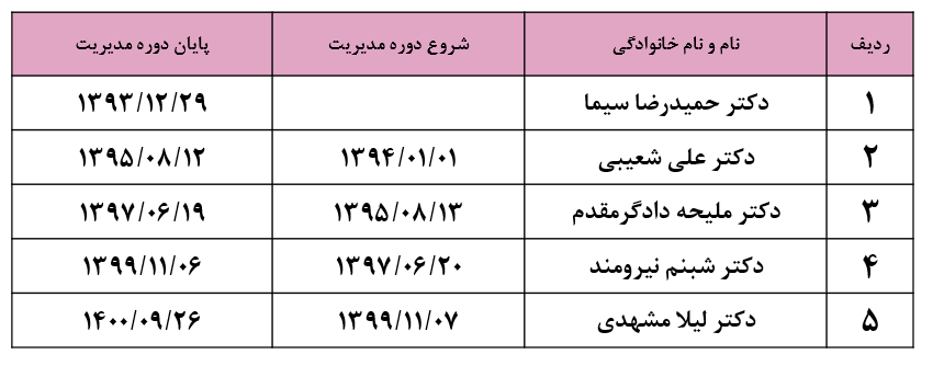 ردیف | نام و نام خانوادگی | شروع دوره مدیریت | پایان دوره مدیریت |