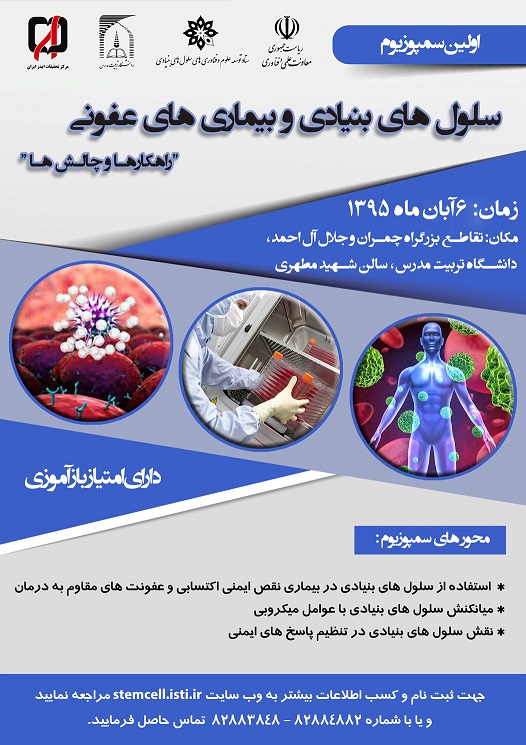 نخستین سمپوزیوم سلول های بنیادی و بیماری های عفونی با همکاری ستاد توسعه و علوم و فناوری های سلول های بنیادی معاونت علمی و فناوری ریاست جمهوری در تاریخ 6 آبان ماه 95 در دانشگاه تربیت مدرس، سالن شهید مطهری واقع در تقاطع بزرگراه چمران و جلال آل احمد برگزار می گردد.