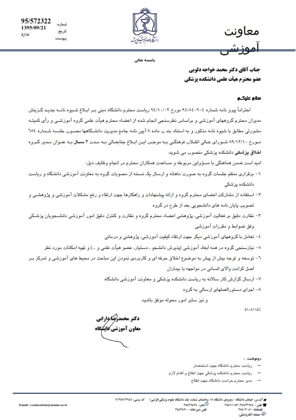 انتصاب جناب آقای دکتر محمد خواجه دلویی عضو هیات علمی دانشگاه به عنوان مدیر گروه اخلاق پزشکی دانشکده پزشکی را تبریک عرض مینماییم و با آرزوی توفیق هرچه بیشتر برای ایشان، امیدواریم در ارتقاء و دستیابی به اهداف آموزشی پژوهشی به موفقیت های هرچه بیشتر دست یابند.