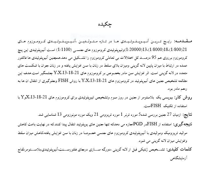 تشخیص پیش از لانه گزینی ناهنجاری های شایع کروموزومی( 13،18،21،X،Y) با استفاده از تکنیک FISH