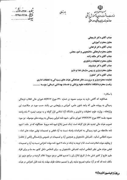02 مرداد 1395 03 مرداد 1395 بازدید: 590 امتیاز: ( 0 Rating ) در خصوص شیوه نامه اجرایی رسیدگی به پرونده های اعتراضات واصله نسبت به آراء قطعی و تصمیمات نهایی هیات های امناء - ممیزه - انتظامی اساتید - انضباطی دانشجویان و آراء و تصمیمات بازنشستگی (ناشی از تخلف) امتیاز کاربران لطفا رای دهید رای 1 رای 2 رای 3 رای 4 رای 5 قبلی بعدی