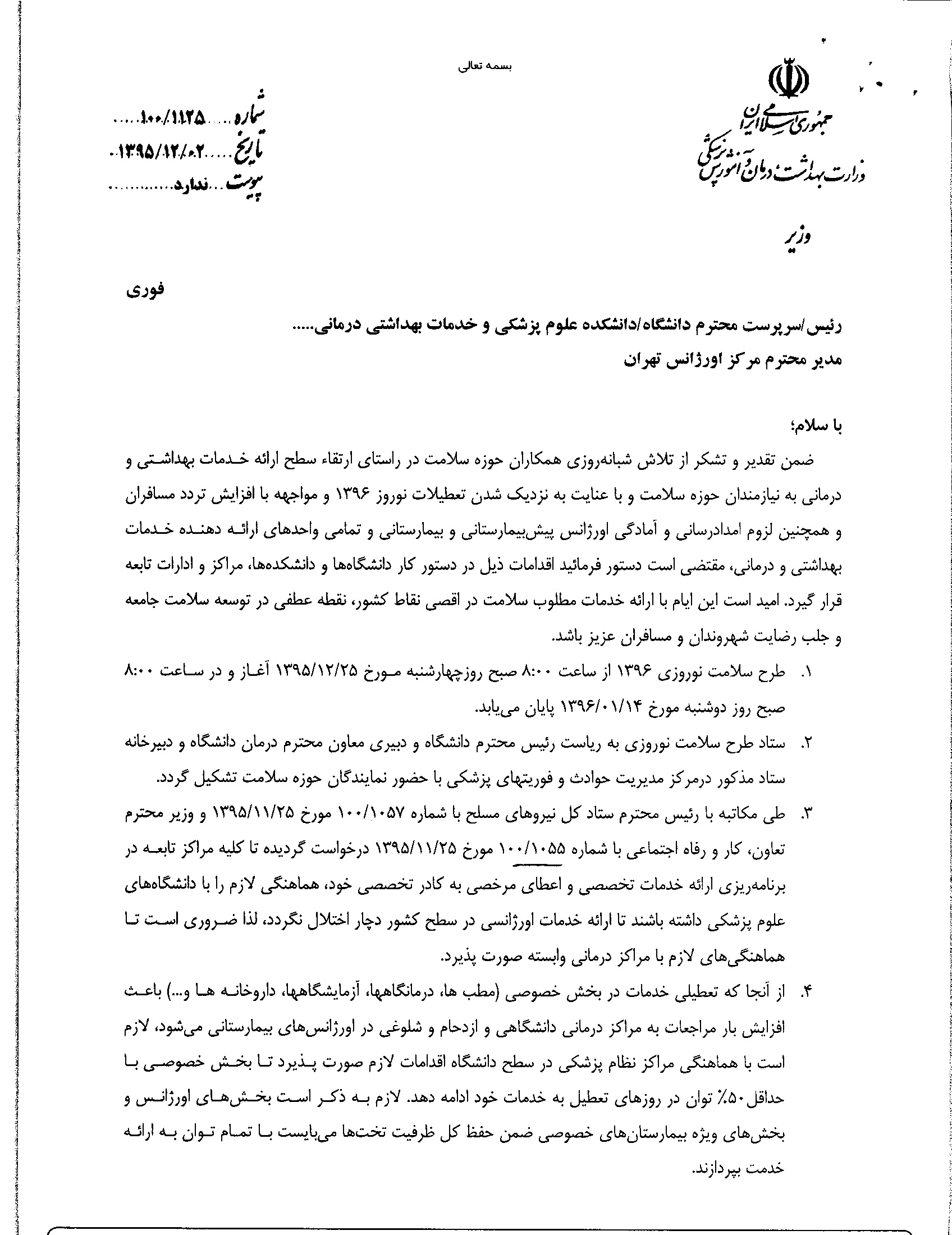15 اسفند 1395 15 اسفند 1395 بازدید: 282 امتیاز: ( 0 Rating ) دستور کار واحدهای ارائه دهنده خدمات بهداشتی و درمانی طرح نوروزی امتیاز کاربران لطفا رای دهید رای 1 رای 2 رای 3 رای 4 رای 5 قبلی بعدی