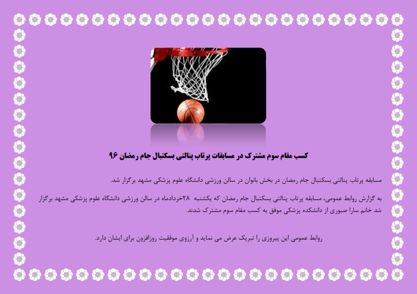 17 تیر 1396 17 تیر 1396 بازدید: 451 امتیاز: ( 0 Rating ) کسب مقام سوم مشترک در مسابقات پرتاب پنالتی بسکتبال جام رمضان 96 توسط همکار گرامی سرکار خانم سارا صبوری امتیاز کاربران لطفا رای دهید رای 1 رای 2 رای 3 رای 4 رای 5 قبلی بعدی