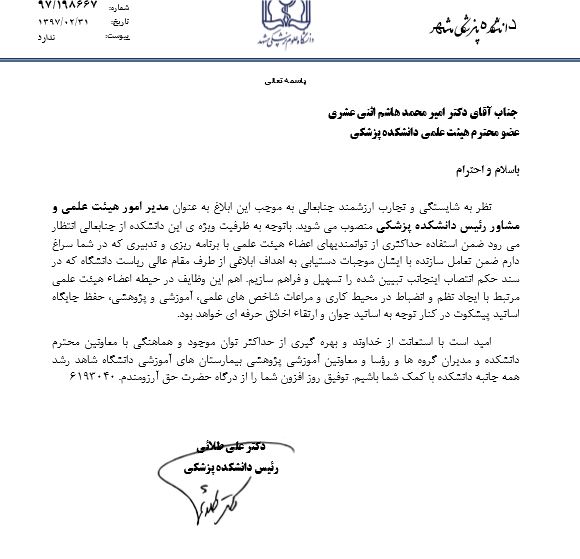 01 خرداد 1397 01 خرداد 1397 بازدید: 434 امتیاز: ( 0 Rating ) انتصاب امتیاز کاربران لطفا رای دهید رای 1 رای 2 رای 3 رای 4 رای 5 به گزارش وبدا، دکترعلی طلائی رئیس دانشکده پزشکی ،درحکمی دکتر امیر محمد هاشم اثنی عشری عضو هیات علمی دانشکده را به عنوان مدیر امورهیئت علمی و مشاور رئیس دانشکده پزشکی منصوب کرد. قبلی بعدی