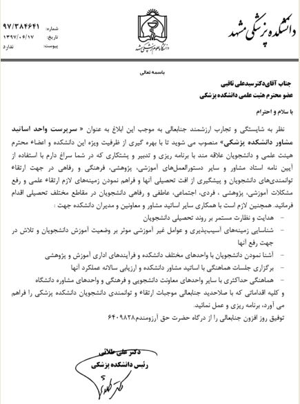 17 شهریور 1397 19 شهریور 1397 بازدید: 336 امتیاز: ( 0 Rating ) انتصاب سرپرست واحد اساتید مشاور دانشکده پزشکی امتیاز کاربران لطفا رای دهید رای 1 رای 2 رای 3 رای 4 رای 5 به گزارش وبدای روابط عمومی دانشکده، ریاست محترم دانشکده پزشکی جناب آقای دکترعلی طلائی، طی حکمی جناب آقای دکترسیدعلی ثاقبی را به عنوان سرپرست واحد اساتید مشاور دانشکده پزشکی منصوب کرد. قبلی بعدی