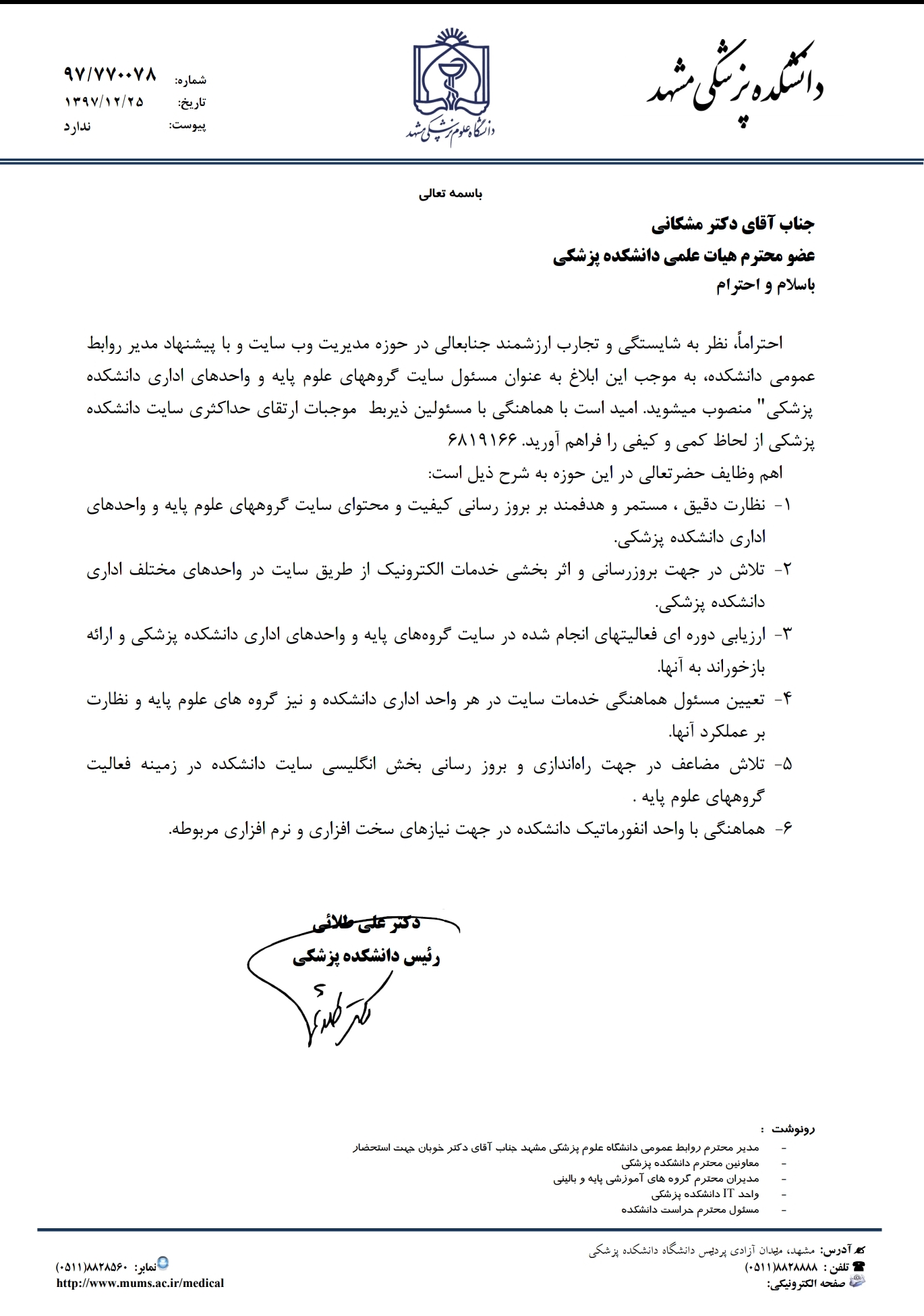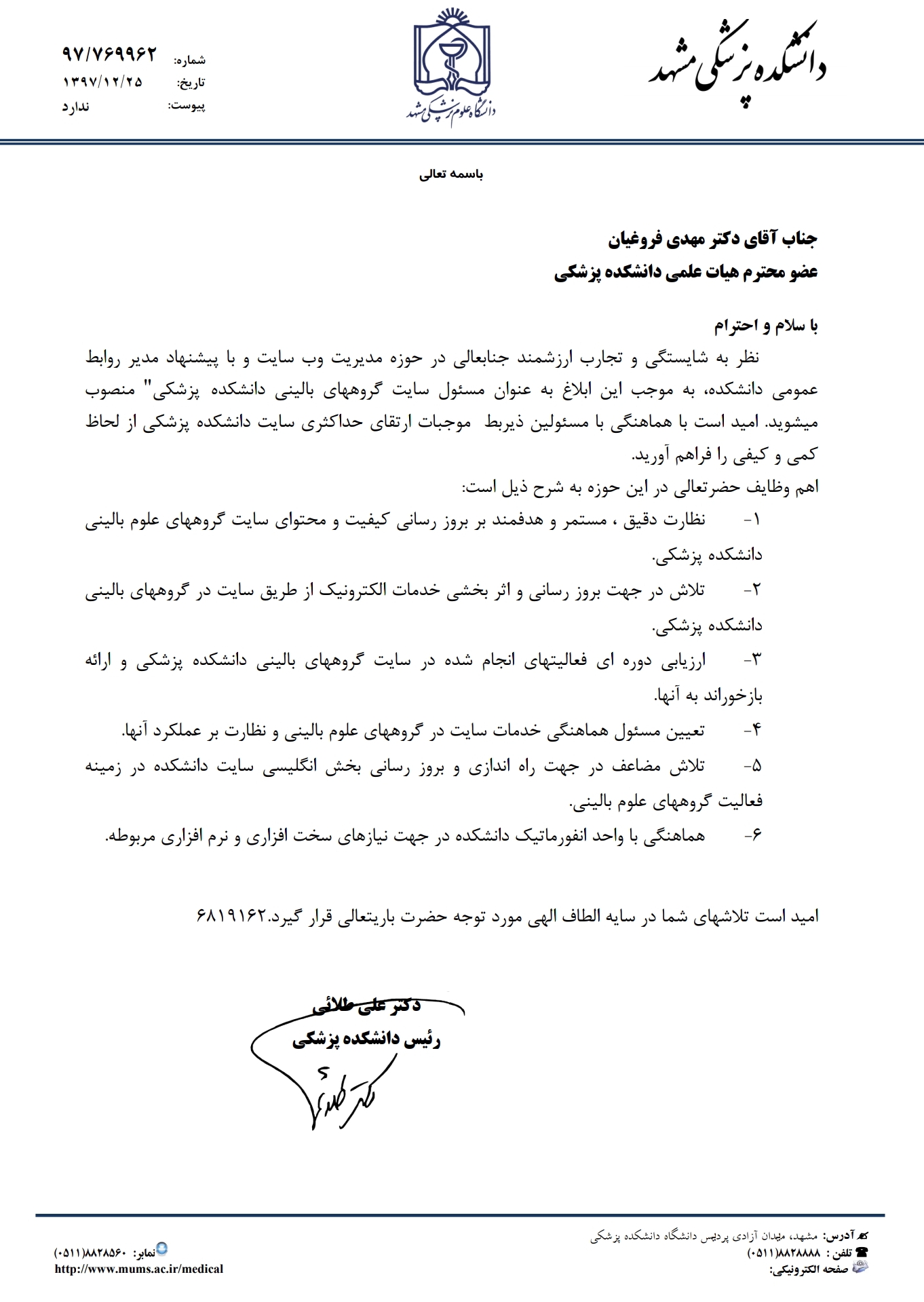 طلائی در جهت ساماندهی و ارتقای کیفیت هرچه بیشتر سایت دانشکده پزشکی، در احکامی جداگانه