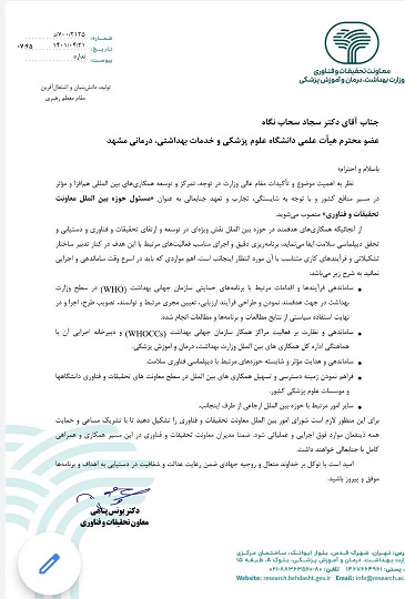 معاون تحقیقات و فناوری وزارت بهداشت و درمان در حکمی، دکتر سجاد سحاب نگاه، عضو هیات علمی گروه علوم اعصاب دانشکده پزشکی مشهد را بعنوان مسئول حوزه بین الملل معاونت تحقیقات و فناوری وزارت بهداشت منصوب کرد.