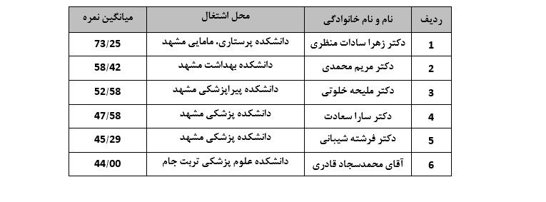 دکتر علی عماد زاده خاطر نشان کرد:بر این اساس دکتر زهرا سادات منظری از دانشکده پرستاری و مامایی مشهد، دکتر مریم محمدی از دانشکده بهداشت، دکتر ملیحه خلوتی از دانشکده پیراپزشکی، دکتر سارا سعادت از دانشکده پزشکی مشهد، دکتر فرشته شیبانی از دانشکده پزشکی مشهد و دکتر محمد سجاد قادری از دانشکده علوم پزشکی تربت جام پذیرفته شدند.