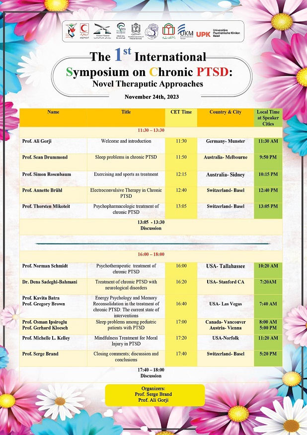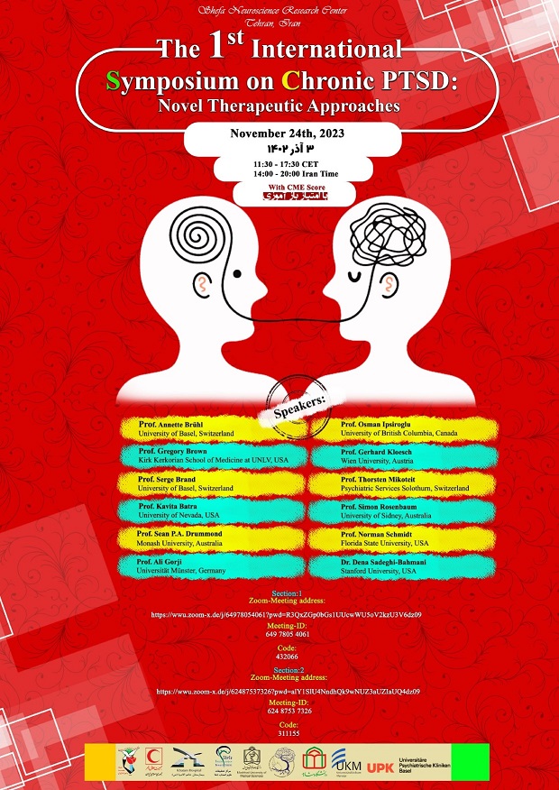 اولین سمپوزیوم مزمن PTSD و راه های درمان جدید آن، با همکاری دانشگاه های ایالت فلوریدا، بازل سوئیس، استنفورد آمریکا، مونسترآلمان، نودا آمریکا و گروه علوم اعصاب دانشگاه علوم پزشکی مشهد در مورخ 3آذر ١۴۰٢ در ساعت 14:00 الی 20:00 برگزار می گردد.