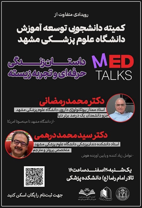 محمد عطار با بیان این مطلب که امروزه سلسله برنامه های Med talk از شناخته شده ترین برنامه های رایج و گفتمان محور اساتید با دانشجویان در دانشگاههای دنیاست، اظهار داشت: برای اولین بار این پروژه را در دانشگاه علوم پزشکی مشهد آغاز می کنیم تا ارتباط دانشجویان با اساتید موفق را از حیطه های تخصصی کلاس های تئوری بالاتر ببریم تا در فرصت بیشتر و بصورت مدون تجربیات موفق آنان در سطح جامعه و زندگی را فرا بگیریم.