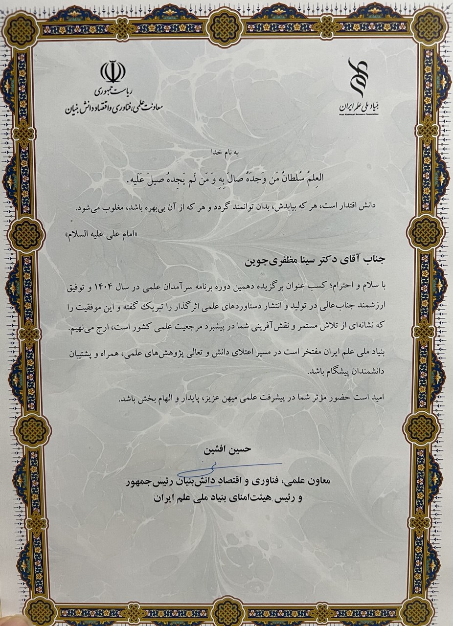 دکتر سینا مظفری جوین، عضو هیئت علمی گروه ژنتیک و پزشکی مولکولی دانشکده پزشکی دانشگاه علوم پزشکی مشهد، در نهمین دوره جشنواره سرآمدان علمی ایران موفق به کسب مدال و جایزه اول این رویداد ملی شد.